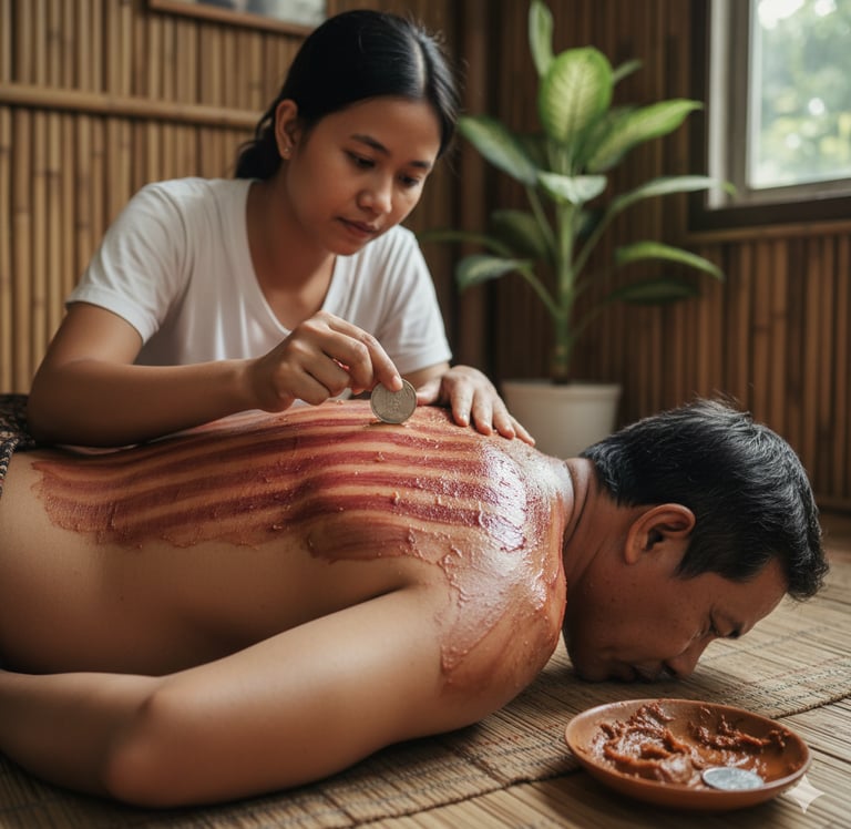 Kerokan, also known as Gua Sha (in Traditional Chinese Medicine) or "coining," is a traditional Indonesian and Southeast Asian folk remedy. While technically a form of scraping therapy rather than a massage technique, it is often performed by massage therapists or family members to treat symptoms related to illness and fatigue.